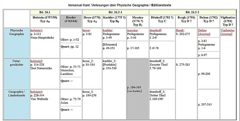 Die „Vorlesungen über Physische Geographie“ sind bisher nur in verschiedenen, unzulänglichen Bearbeitungen veröffentlicht. Dies gilt auch für den 1923 erschienenen Band IX der Kant-Ausgabe der Preußischen Akademie der Wissenschaften, die Text und Arrangement der Ausgabe von Friedrich Theodor Rink aus dem Jahr 1802 zugrunde gelegt hat. Voraussetzung für die kritisch gesicherte Edition der „Vorlesungen über Physische Geographie“ in Band XXVI der Akademie-Ausgabe ist die Aufklärung einer höchst verzweigten und komplizierten Überlieferungsgeschichte sämtlicher Textzeugen – Autographe von Kant selbst, Nachschriften von Studenten, u. a. von Johann Gottfried Herder, diverse Drucke – und der literarischen Quellen der Vorlesung selber. Ziel ist sowohl eine adäquate Darstellung der Überlieferung in Form einer elektronischen Dokumentation als auch die Herstellung lesbarer, kritisch geprüfter und erläuterter Texte für den Buchdruck.